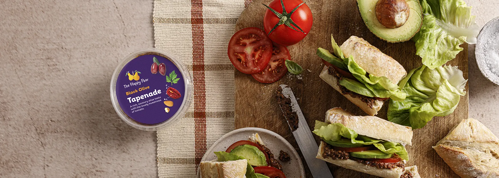 Black Olives (33%) [Black Olives, Salt, Vinegar, Extra Virgin Olive Oil], Olive Oil, Rapeseed Oil, Almonds (Nuts), Water, Sundried Tomatoes (6%) [Sundried Tomatoes, Salt], Lemon Juice, Capers (4%) [Capers, Vinegar, Salt], Garlic, Date Syrup, Balsamic Vinegar, Parsley, Oregano, Black Pepper.